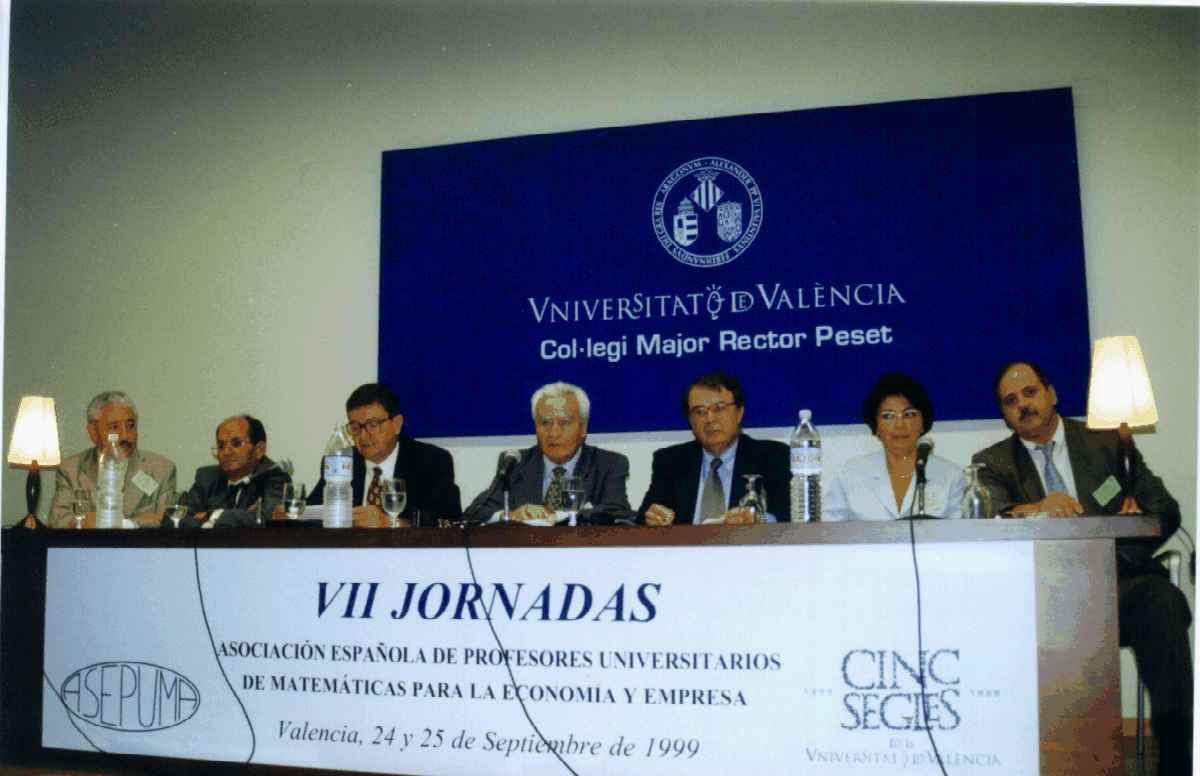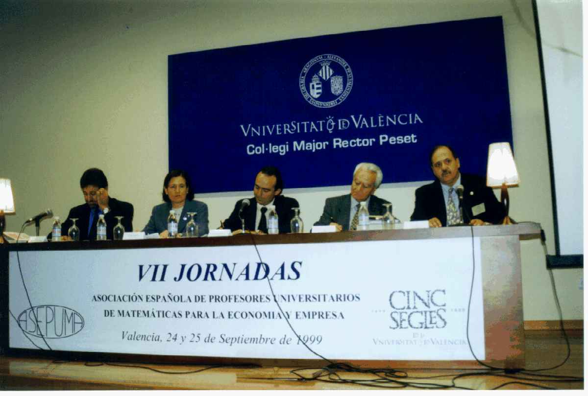 RESUMEN DE LAS JORNADAS Durante los días 24 y 25 de Septiembre de 1.999 se celebraron en el C.M.U. Rector Peset de Valencia las VII Jornadas de ASEPUMA. Las Jornadas comenzaron con la recepción de los participantes, entrega de documentación y material, así como la correspondiente sesión de apertura con la presidencia de D. Ramon Torcal, Vice-rector de relaciones con la Sociedad de la Universitat de Valencia; de Dª María Bonilla, Directora General de Economía de la Generalitat Valenciana; de D. Máximo Ferrando, Decano de la Facultad de Ciencias Económicas y Empresariales; de D. Julio García Villalón, Presidente de ASEPUMA y de D. Ramon Sala, Presidente del Comité Organizador de las Jornadas.